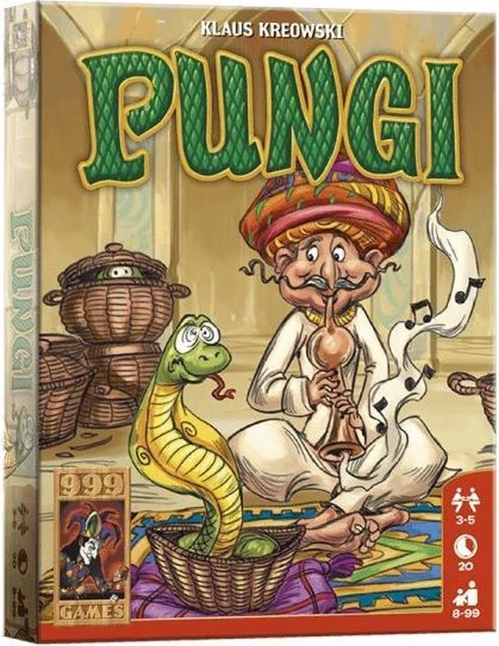 In dit kaartspel probeer je de meest waardevolle slangen te vangen en eventueel 1 of meer slangenbezweerders te verzamelen. Slangenbezweerders kunnen aan het einde van het spel van de minpunten van slangen pluspunten maken, maar heb je geen slangen met minpunten, dan worden van 1 slang de pluspunten juist minpunten! Elke ronde liggen er zoveel kaarten als het aantal spelers op tafel. Je krijgt 5 kaarten, waarvan op de achterkant dieren staan die voor alle andere spelers zichtbaar zijn. Om beurten speel je 1 gedekte kaart. De spelers die een kaart van het meest gespeelde dier spelen, krijgen de eerste kaarten op volgorde van de waarde op hun gespeelde kaart, enzovoort. Pungi is een bijzonder origineel kaartspel, waarin je deels moet samenwerken, maar ondertussen je eigen belang niet uit het oog mag verliezen.