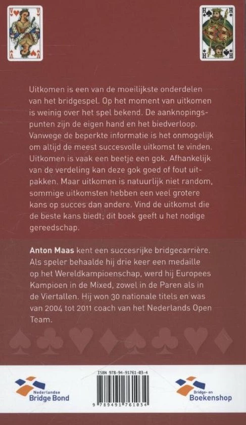 Met dit bridgeboek getiteld ?Uitkomen? leer je bridgen en word je de volgende Anton Maas. Uitkomen wordt vaak gezien als het moeilijkste onderdeel van het bridgespel. Op het moment van uitkomen is er weinig over het spel bekend. De aanknopingspunten zijn de eigen hand- en het biedverloop. Vanwege de beperkte informatie, is het onmogelijk altijd de meest succesvolle uitkomst te vinden. Uitkomen is vaak een gok. Afhankelijk van de spelverdeling, kan deze gok goed of fout zijn. Sommige uitkomsten hebben een veel grotere kans op succes dan andere. In dit boek krijg je de nodige tools die de beste kans bieden.