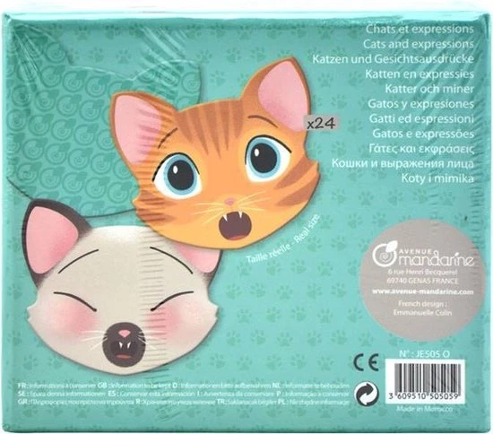 Bevat 12 paar verschillende gezichten en expressies van katten. Deze zitten verpakt in een leuk doosje met magnetische sluiting.