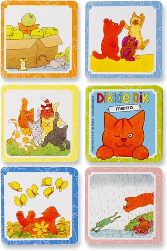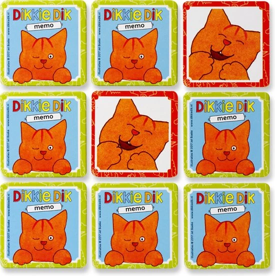 Memo is bij iedereen bekend en kinderen zijn er helemaal dol op. Voor dit memospel zijn afbeeldingen gebruikt van Dikkie Dik en dat maakt het voor kinderen heel herkenbaar en extra leuk. Zo kun je zoeken naar Dikkie Dik in een mand met peren, aan de waslijn, tussen de vlinders enz.