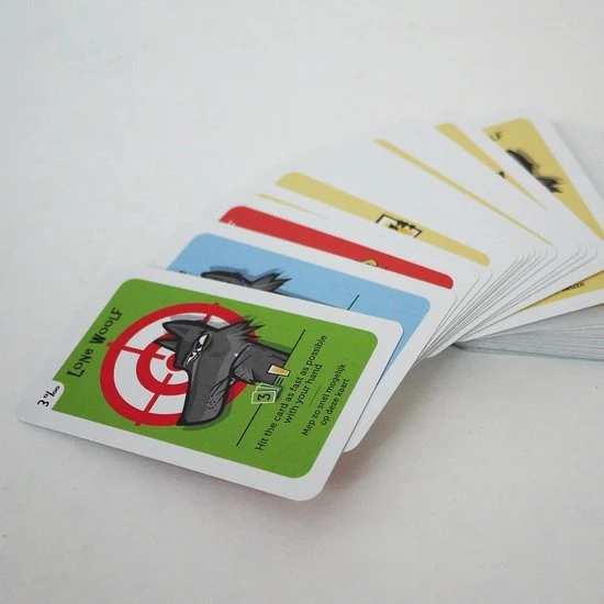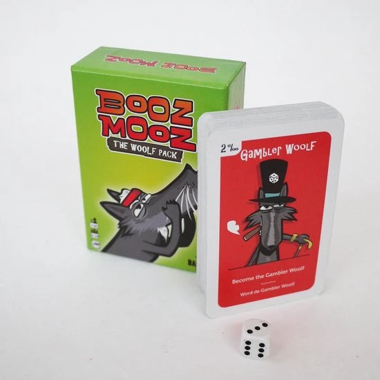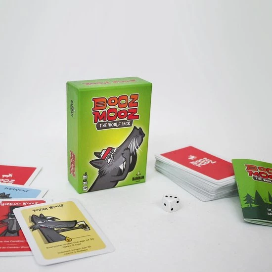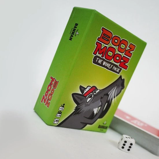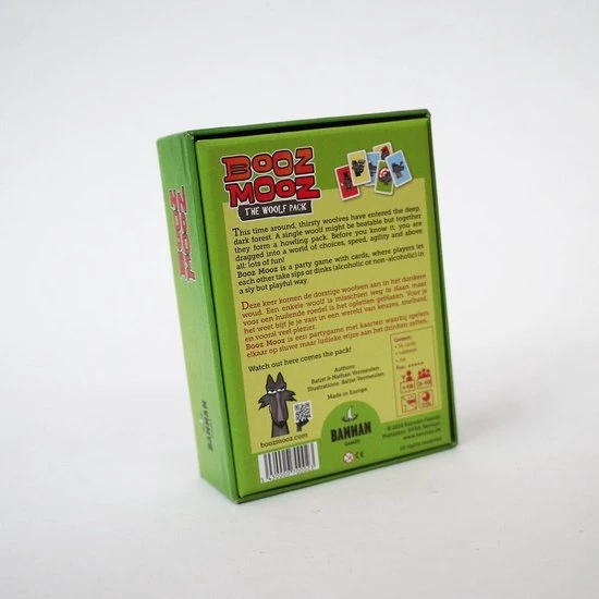 Deze Booz Mooz editie ‘The woolf Pack’ is tweetalig: Engels en Nederlands en bevat 58 kaarten, een dobbelsteen en een boekje met Engelstalige en Nederlandstalige uitleg.