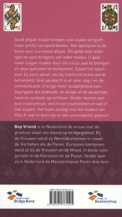 Goed afspel maakt bridgen veel leuker en geeft meer profijt van goed bieden. Het speelplan is de basis voor succesvol afspel. Dit geldt voor ieder spel en voor bridgers van ieder niveau. U gaat meer slagen maken door structuur aan te brengen en door patronen te herkennen. Zowel het speelplan bij sans-atout als bij troefcontracten wordt behandeld. Veel aandacht is er voor slag één en de communicatie. U krijgt meer duidelijkheid over begrippen als blokkade, de veilige en de gevaarlijke hand en verliezer op verliezer. Verder komen aan bod troefcontrole, wel of niet troeftrekken en wel of niet snijden. Het boek eindigt met het maken van Plan B: wat te doen als er iets onverwachts gebeurt.