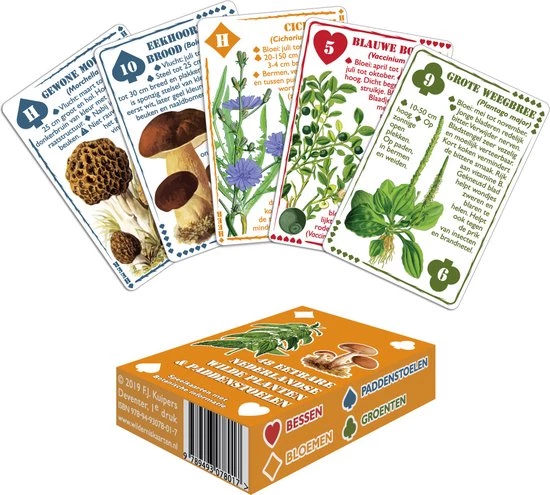 Het pakje bevat normale speelkaarten met informatie over 48 eetbare planten en paddenstoelen uit Noord Europa, aangevuld met een inhoudsopgave op de Azen ?n de uitleg over de universele eetbaarheidstest om te beoordelen of een (niet op de kaarten voorkomende) plant eetbaar is of niet. De kaarten bevatten elk de botanische informatie en mooie afbeeldingen van de planten en paddenstoelen.