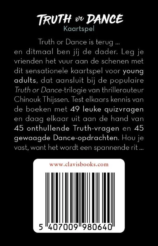 Truth or Dance is terug … en ditmaal ben jíj de dader. Leg je vrienden het vuur aan de schenen met dit sensationele kaartspel voor young adults, dat aansluit bij de populaire Truth or Dance-trilogie van thrillerauteur Chinouk Thijssen. Test elkaars kennis van de boeken met 49 leuke quizvragen en daag elkaar uit aan de hand van 45 onthullende Truth-vragen en 45 gewaagde Dance-opdrachten. Hou je vast, want het wordt een spannende rit …