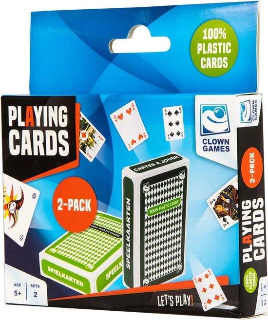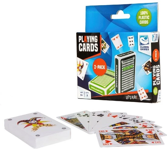 Speelkaarten van 100% plastic, in de echte Clown Games uitvoering! Twee sets speelkaarten waarmee je oneindig veel spelletjes kunt spelen. Inhoud: 1 pak kaarten in donkergroen en 1 pak kaarten in lichtgroen. Wordt geleverd in full-colour doosje. Geschikt voor kinderen vanaf 5 jaar.