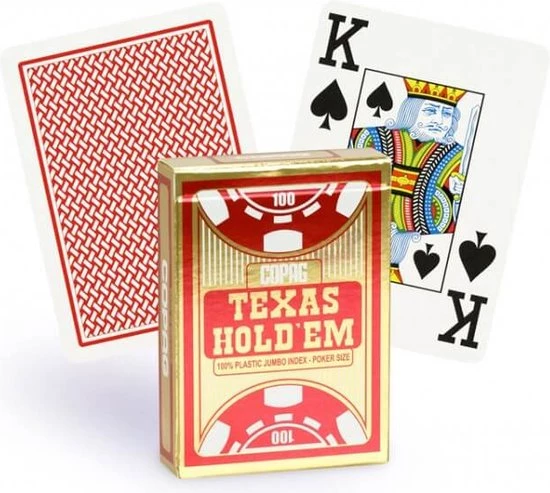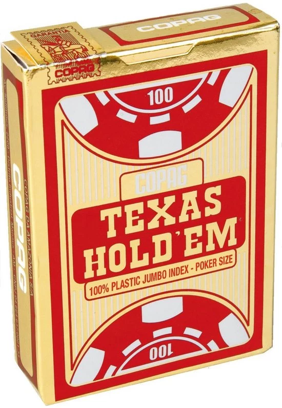 Copag Texas Hold’em Gold pokerkaarten, Deze kaarten zijn speciaal ontwikkeld naar de wensen van pokerspelers wereldwijd, daarom ligt de nadruk vooral op het symbool die op de kaart staat, de symbolen zijn extra groot en extra duidelijk weergeven zodat je in een oogopslag kunt zien welke kaart op tafel ligt.