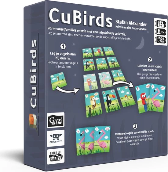 CuBirds is een bekroond kaartspel dat in diverse landen is uitgekomen. De illustraties zijn van de hand van Kristiaan der Nederlanden en zijn bijzonder fraai en heel opvallend. Ze worden wel omschreven als kubistisch of ‘Minecraf-achtig’. Het spel kan gespeeld worden met 2 tot 5 spelers en is leuk en geschikt voor zowel kinderen (8+) als volwassenen.