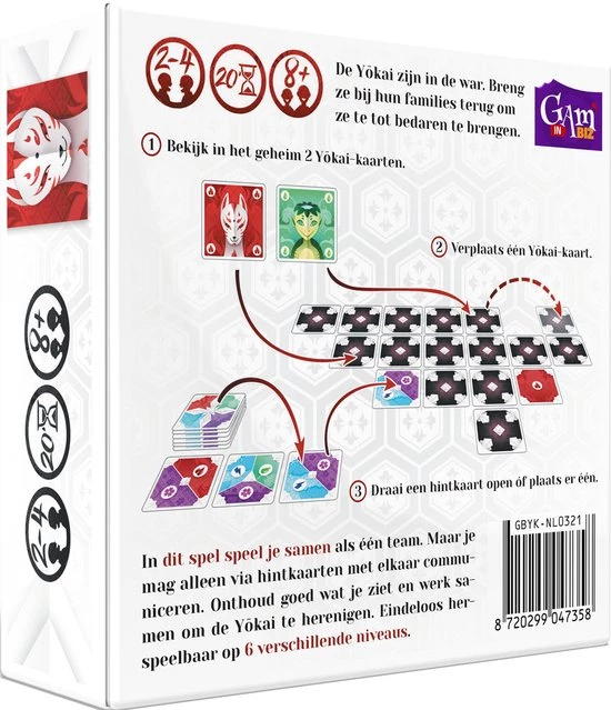 De Yōkai zijn in de war. Deze Japanse geesten zijn hun familieleden kwijtgeraakt en daardoor bepaald niet blij. Breng ze tot bedaren door ze weer met hun eigen verwanten samen te brengen. In dit spel speel je samen als één team. Maar je mag alleen via hintkaarten met elkaar communiceren. Onthoud goed wat je ziet en werk samen om alle Yōkai-kaarten kleur bij kleur te leggen en daarbij zo min mogelijk hintkaarten te gebruiken.