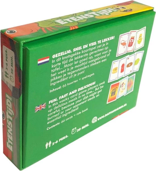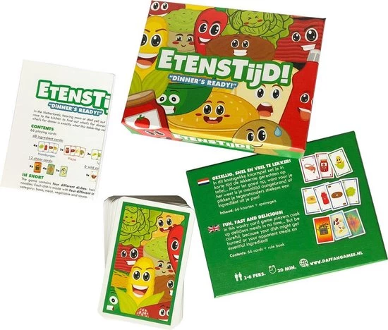 Etenstijd! is een razendsnel kaartspel voor 2 tot 6 personen. Het spel bestaat uit vier verschillende gerechten: hamburger, pizza, taco en noodles. Deze gerechten bestaan elk uit vier soorten ingredi?nten: basis, vlees, groente en saus.