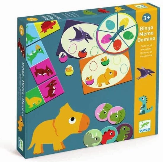 Leuke speeldoos van Djeco met klassiekers bingo, memo en domino met dinosaurus-thema.