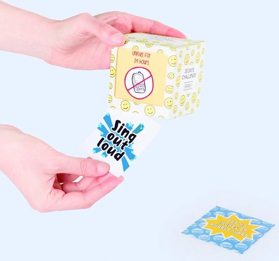 30 day challenge van DOIY. Kubus met 30 verrassende uitdagingen. De uitdagingen inspireren tot een gezondere levensstijl door middel van geschreven opdrachten en vrolijke illustraties. Helpt bij het ontwikkelen van betere gewoontes. De 30 days challenge werkt als een scheurkalender. Gekleurde en vrolijke box. Opdrachten zijn in het Engels. Leuk om cadeau te geven. Afmeting: 13 x 9 x 20 centimeter.