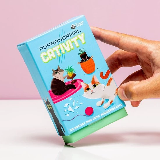 Purranormal Cativity spel van Fizz. Spel met katten in de hoofdrol, waarbij je moet raden wat de stoute kat heeft gedaan, waarom en waar hij is verstopt. Grappig spel voor kattenliefhebbers, gebaseerd op het spel Cluedo. Purranormal Cativity komt inclusief 36 kaarten, vier potloden en honderd antwoordbriefjes. Geschikt voor drie tot zes spelers vanaf acht jaar.
