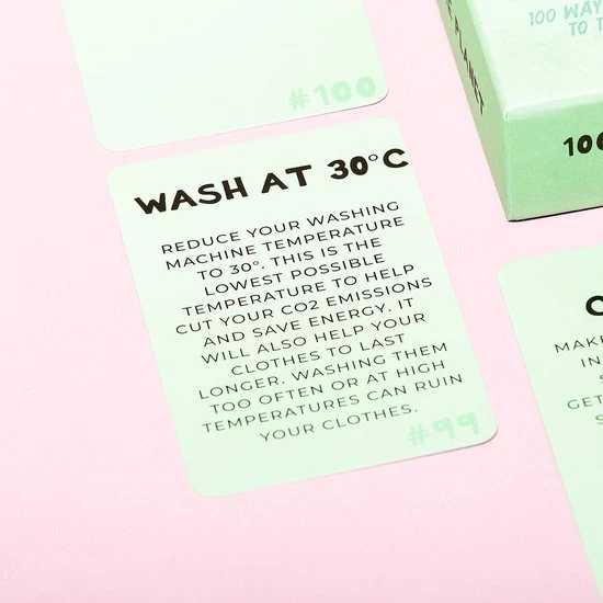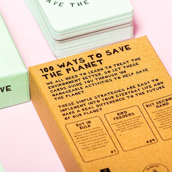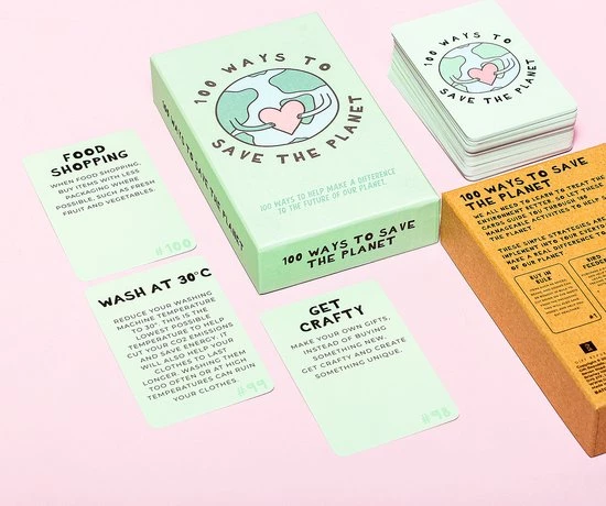 100 Ways To Save The Planet kaarten van Gift Republic. Kaartenset die tips geeft hoe je milieubewuster kunt leven. In totaal zitten er 100 kaarten in de set, die je allerlei handige tips geven. Koop bijvoorbeeld bepaalde producten groot in of neem je eigen verpakking mee. Let op: geschreven in het Engels.
