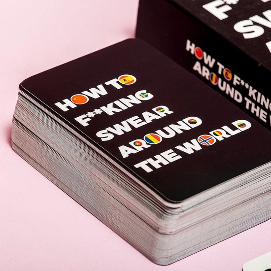 How to fucking swear around the world kaarten van Gift Republic. Kaartenset die vertelt welke scheldwoorden er in welke taal zijn. Op de kaart staat het scheldwoord, het land, de taal, de Engelse vertaling en hoe beledigend het is. In totaal zitten er 100 kaarten in de set die je leert over de grens te schelden. Perfect voor reizigers.