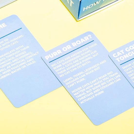 How to speak kaarten van Gift Republic. Kaartenset die uitlegt hoe je de (lichaams)taal van je kat kunt interpreteren. In totaal zitten er 100 kaarten in de set die je alles over je kat vertellen. De kaartjes zijn ge?llustreerd en hebben Engelse teksten. Leuk om cadeau te geven aan een dierenvriend of iemand die net een kitten heeft gekregen.