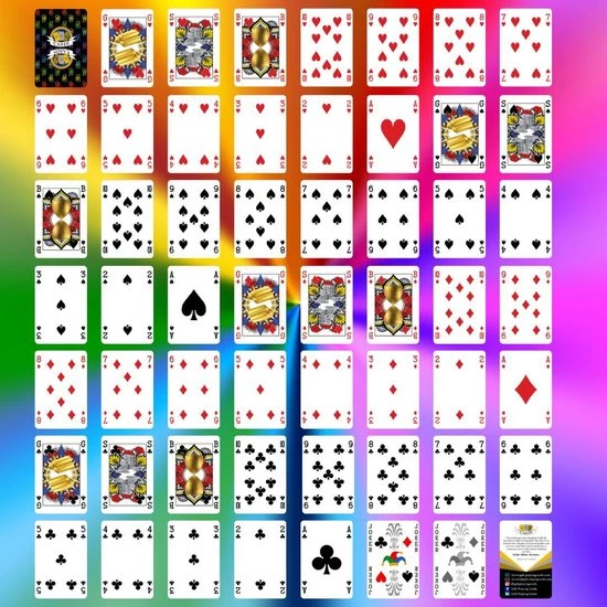 Alle andere kaarten van het spel zijn hetzelfde gebleven, van de 2 tot de Aas, en natuurlijk de 2 Jokers. Eentje neutraal en eentje full-color.