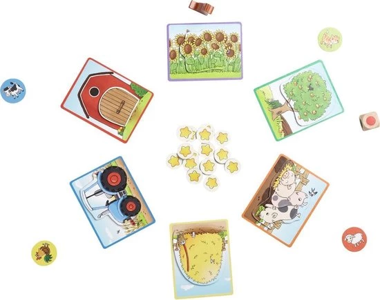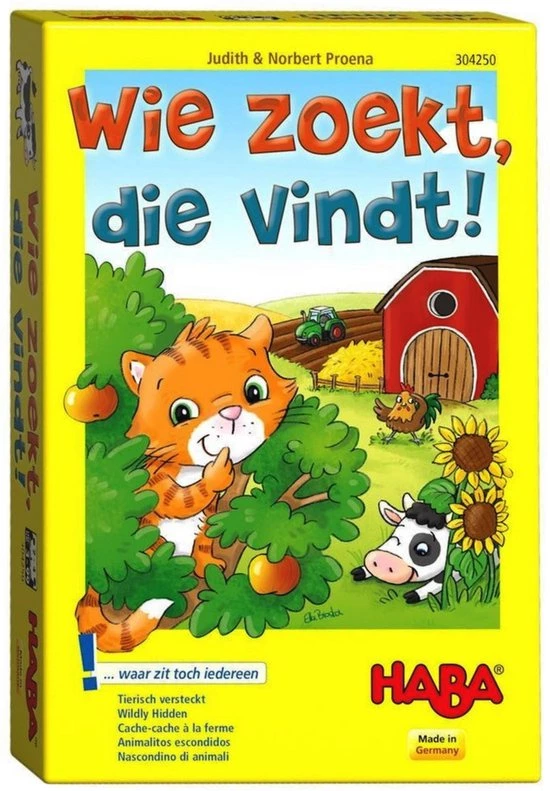 Op de boerderij spelen de dieren verstoppertje en proberen ze het beste verstopplekje te vinden. De spelers moeten in de hooiopper, onder de bomen of in de stallen zoeken en vinden hopelijk alle dierenvriendjes. Ook boerderijhond Waldi helpt mee. Wie het beste kan zoeken, wint het spel! Inhoud: 6 verstopplaatsen, 6 verstopafdekkingen, 4 dierenvrienden (kat, koe, haan en schaap), 17 puntenchips (sterren), 1 figuur “boerderijhond Waldi”, 1 dobbelsteen met kleuren, 1 handleiding.