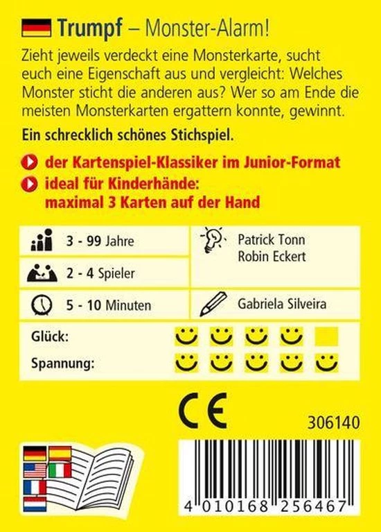 Dat is toch monsterlijk! Ogen, hoorns, tanden, armen en benen – deze monsters hebben er wel erg veel van. De spelers trekken telkens blind een monsterkaart, zoeken een eigenschap en vergelijk: welk monster steekt het andere naar de kroon? Wie aan het einde de meeste monsterkaartjes heeft verzameld, is de winnaar.