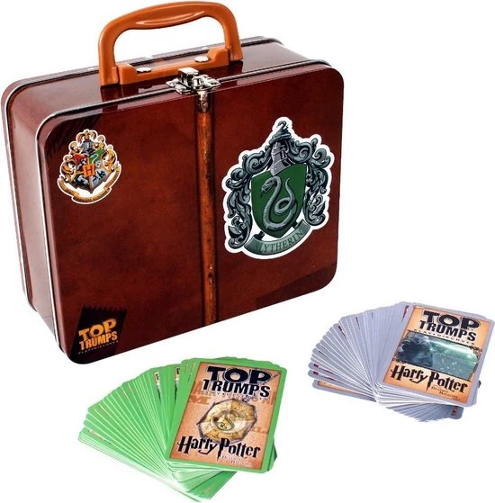 Get on board the Hogwarts Express with this Top Trumps Slytherin Suitcase Tin! Containing two packs of Harry Potter Top Trumps based around Harry Potter and the Deathly Hallows Parts 1 and 2, this is a great addition to any Potter fan?s wizarding world.
