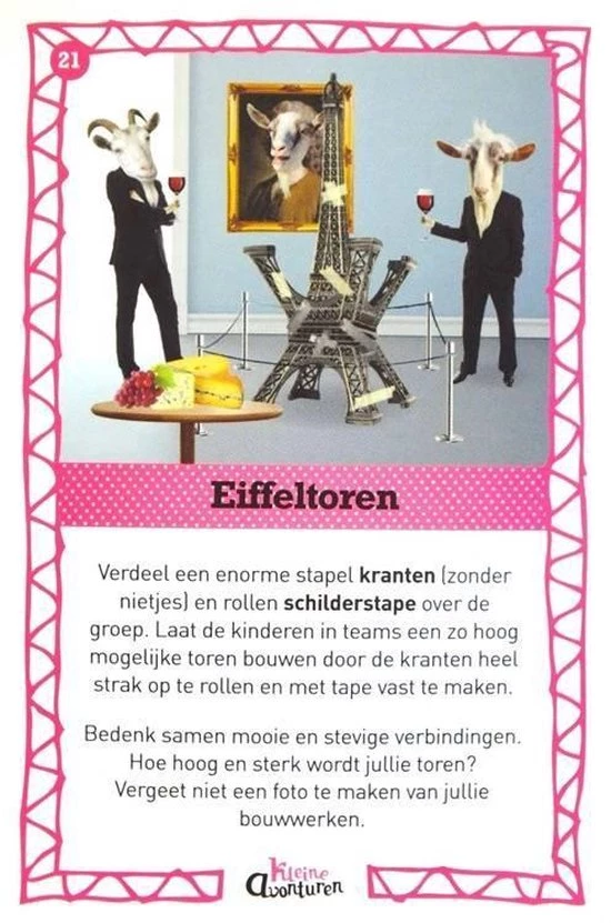 Auteur Inge Schilders. Wat is Kleine Avonturen voor Groepen? Na het succes van Kleine Avonturen voor Ouder en Kind is er nu een vervolg gegeven aan dit spel. Vanuit basisscholen uit Nederland en Belgie kregen wij het verzoek om een spel te ontwikkelen dat ook met groepen kinderen uitgevoerd kan worden. Na flink zwoegen en testen is het spel nu hier! Uitvoering met spelactiviteiten, uit te voeren op school, tijdens een feestje, in het gezin en zelfs op kamp! Het bevordert het creatief denken, het samenspel en zorgt voor een flinke dosis speelplezier! 3+
