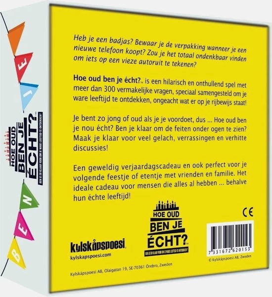 ‘Hoe oud ben je ?cht?’ is een hilarisch en onthullend spel met meer dan 300 vermakelijke vragen, speciaal samengesteld om je ware leeftijd te ontdekken, ongeacht wat er op je rijbewijs staat!