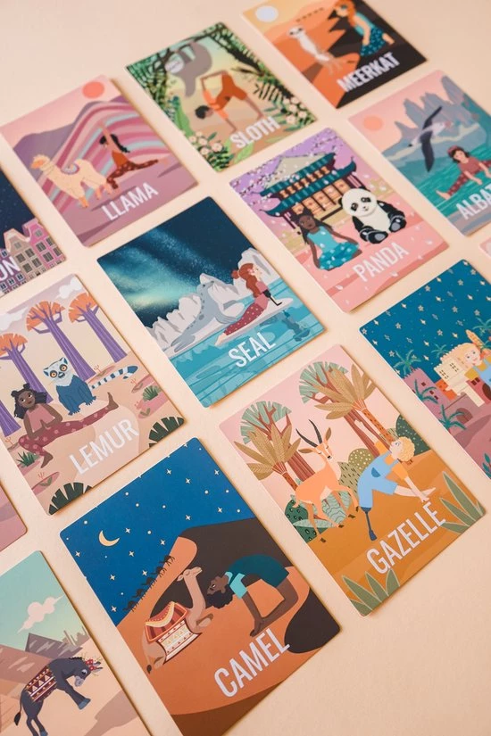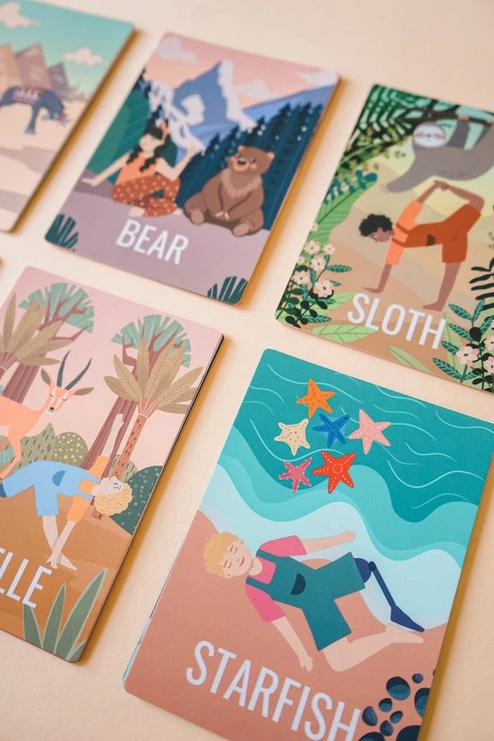 30 met de hand geïllustreerde inclusief partneryogakaarten voor kinderen.