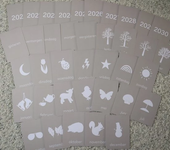 De seizoenen, dagen van de week, jaartallen (2021 t/m 2030), dagaanduidingen, maanden, getallen 1 t/m 31, alfabet (op de achterkant van de kaarten staan zowel de hoofd- als kleine letter)