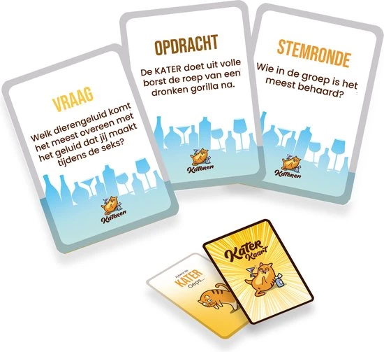 KATEREN – HET DRANKSPEL – Bij KATEREN draait het om de spelkaarten. Die geven jou en je vrienden de meest hilarische opdrachten, pittige vragen en beruchte stemrondes. Wees niet bang voor public exposure, want zelfs je social media wordt als wapen ingezet. Tussen de spelkaarten zitten Kater Kaarten verstopt. Pak jij een van deze kaarten? Dan ben jij de KATER en zullen de meeste heftige kaarten voor jou zijn! Durf je niet? Dan is het drinken geblazen!