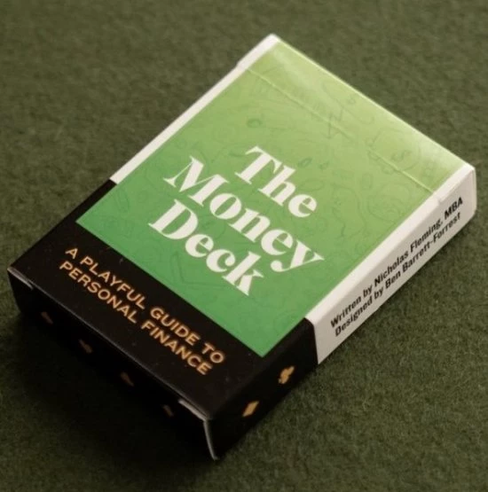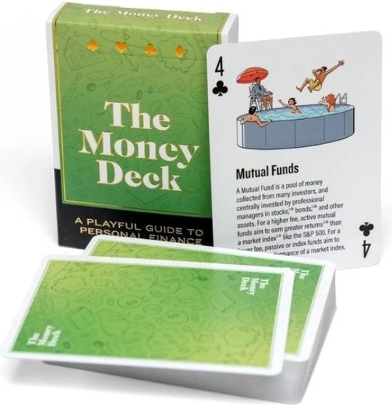 Het is een gids op zakformaat voor persoonlijke financiën, beknopt vastgelegd op 52 speelkaarten. Of u nu uw winst wilt redden, in uw financiële toekomst wilt investeren of gewoon kaartspel of poker wilt spelen, dit kaartspel helpt zowel beginners als professionals geld te ontrafelen. Elke kaart biedt een slim samengesteld concept, kunstig geleverd met humor, eenvoud en een onberispelijk ontwerp.