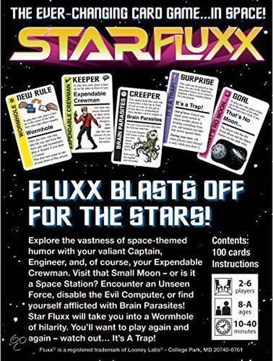 De sky is the limit; maar dat geldt niet voor Star Fluxx! Deze expansieset voor het kaartspel Fluxx combineert 100 space-gerelateerd kaarten (zoals Small Moon en Cute Fuzzy Aliens) met de eenvoudige spelregels van Fluxx. Pak een kaart; speel een kaart en het spel volgt zichzelf!