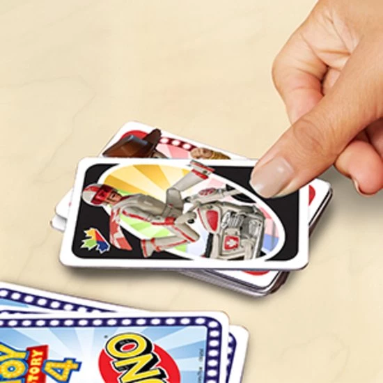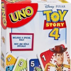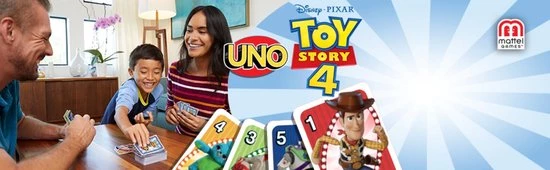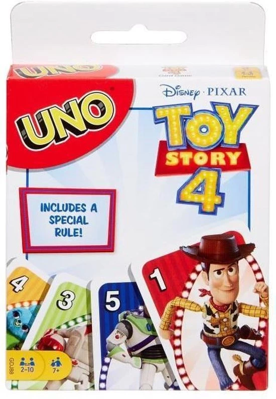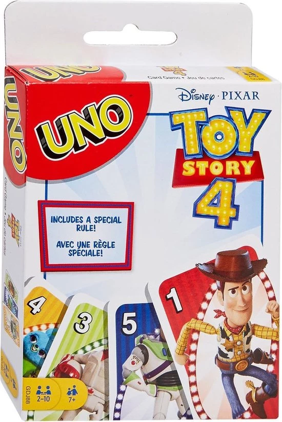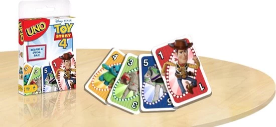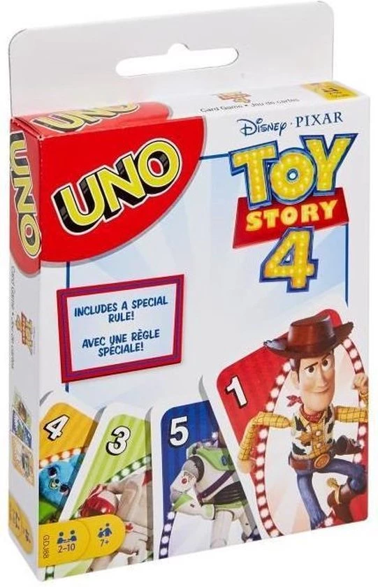 Het doel van dit spel? Troef de eerder gespeelde kaart met een kaart van dezelfde kleur of hetzelfde symbool. Maar let goed op de actiekaarten en hou het bluffen van de tegenstander in de gaten! Nu verkrijgbaar in een toffe Toy Story 4 editie. Speel het spel nu met je favoriete personages uit de film.