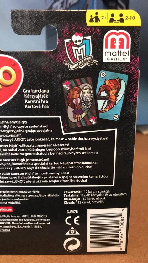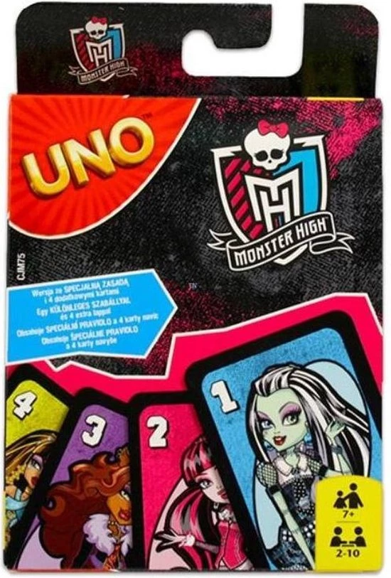 UNO (Polska)is er nu ook in een speciale MONSTER HIGH-uitvoering met een nieuwe spelregel. Inclusief 112 speelkaarten en spelregels. Let op dit is een buitenlandse versie voor Polen, Hongarije, Tjeschie en Slowakije.