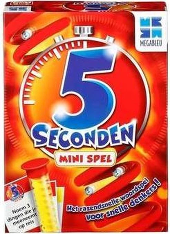 5 Seconden is een gezellig familiespel, waarbij je snel moet denken en spreken. Het spel bevat meer dan 700 grappige en originele vragen, waarbij je binnen 5 seconden 3 antwoorden moet geven. De vraag lijkt eenvoudig, maar zo makkelijik is het nog niet door de tijdsdruk. Lukt het jou om vloeiend 3 antwoorden te noemen of begin je net als de meesten te stotteren en te hakkelen?