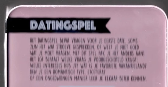 | Verpakkingsinhoud | 1, datingspel, 50, kaarten, in, blik |