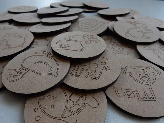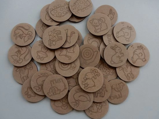 De memorie is van mdf en is per kaartje 3mm dik en is +/- 5 cm doorsnee.