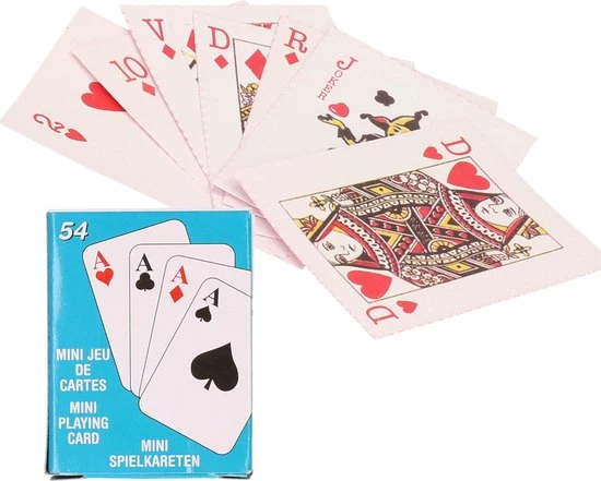Mini basic speelkaarten 5.5 x 4 cm in doosje. Materiaal: karton. 48 kaarten per spel. Leuke kleine kaartspelletjes voor kinderen en/of volwassenen. Handig formaatje.