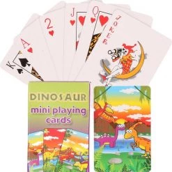 Mini dinosaurussen thema speelkaarten 6 x 4 cm in doosje. Materiaal: karton. 48 kaarten per spel. Leuke kleine kaartspelletjes voor kinderen en/of volwassenen. Handig formaatje.