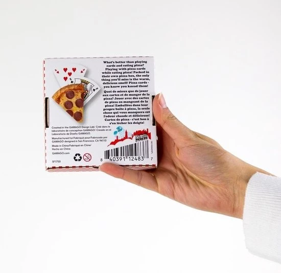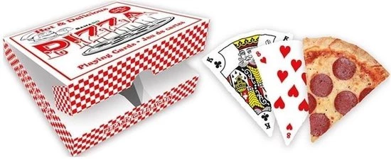 Een spel gadgets speelkaarten in de vorm en met aan de achterkant een print van pizzapunten. Afmeting kaart: ca. 10 cm. Verpakt in een mini pizzadoosje. Materiaal: karton. De kaarten zijn Engels talig: Jack, Queen, King. Let op: dit is geen speelgoed en niet geschikt voor kinderen.