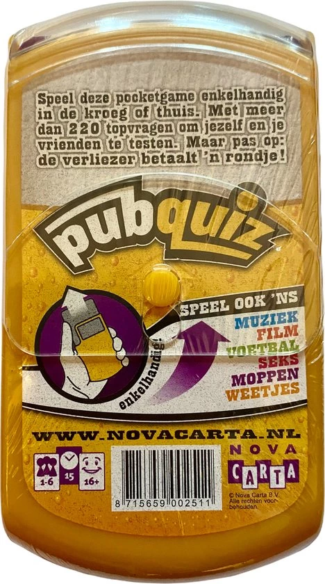Speel deze pocketgame in de kroeg of thuis. Meer dan 220 topvragen om jezelf en je vrienden te testen. Maar pas op: de verliezer betaalt ’n rondje!