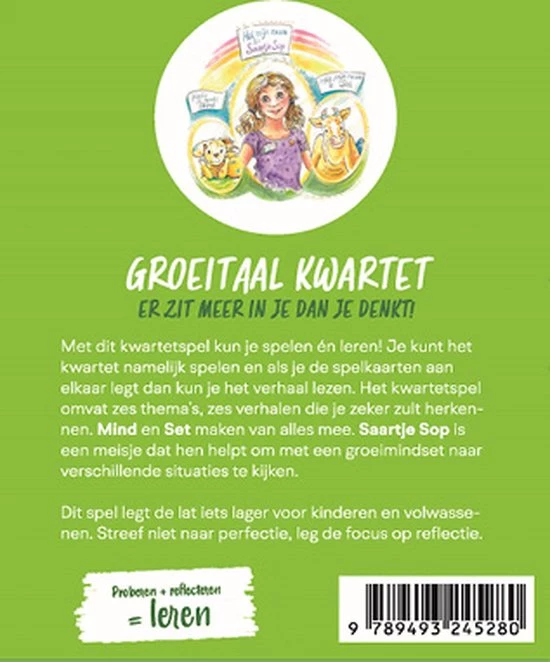 Dit kwartetspel is tweeledig: je kunt spelen en leren. Je kunt het kwartet namelijk spelen en als je de spelkaar?ten aan elkaar legt dan kun je het verhaal lezen. Het kwar?tetspel omvat zes thema’s(die in het boek staan), zes verhalen die je zeker zult her?kennen. Mind en Set maken van alles mee. Saartje Sop is een meisje dat hen helpt om met een groeimindset naar verschillende situaties te kijken. Na elk verhaal praat Saartje Sop met Mind en Set. Ze stelt hen vragen en vertelt dingen waar je veel van kunt leren. Ook aan jullie stelt ze vragen om samen over te praten!