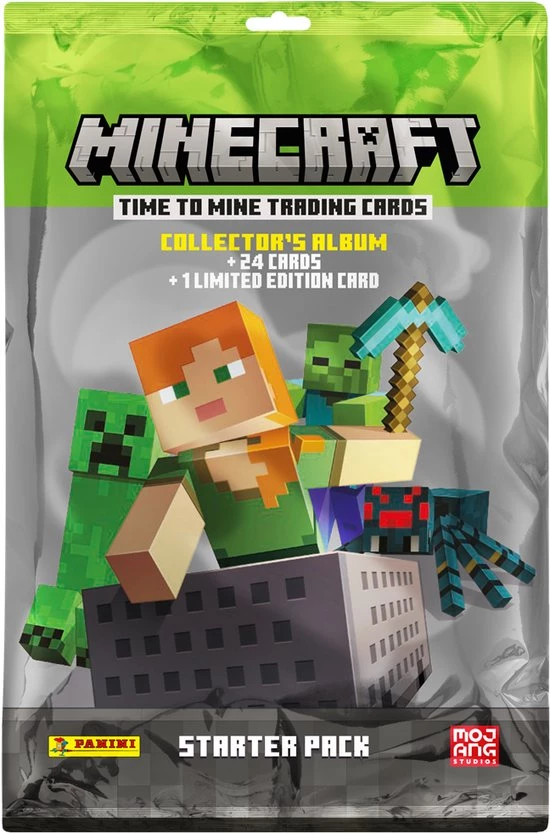 | Verpakkingsinhoud | Minecraft, 2, start, pakket, betsaat, uit:, 1., Collectors, Alburm, 2., 24, stuks, Minecraft, Cards, 3., 1, stuk, Limited, Edition, Card |