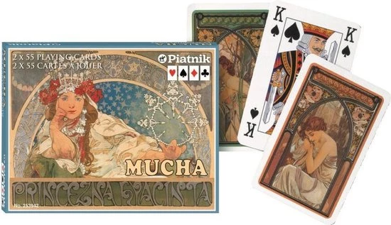 Twee sets speelkaarten in een giftdoos. De achterkant van elke set is bedrukt met een schildering van Alfons Mucha. De kaarten zijn in bridge formaat.