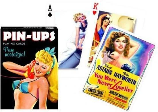 Speelkaarten met daarop plaatjes van aantrekkelijke dames. 2-index, normaal pokerformaat, geprint door Piatnik.