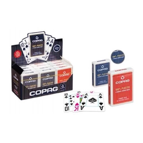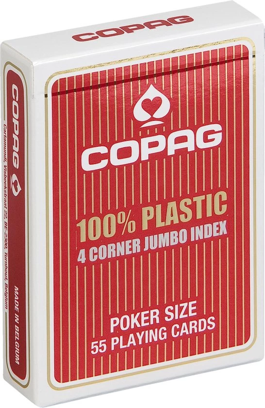 COPAG wordt beschouwd als d? ultieme pokerkaart. Doordat deze kaarten van 100% PVC plastic zijn gemaakt, zijn ze beter bestand tegen gebruikssporen, in tegenstelling tot kartonnen speelkaarten. Probeer je een COPAG kaart te plooien, springt deze terug naar haar oorspronkelijke kaarsrechte vorm, zonder markeringen te vertonen. Praktisch dus voor pokerspelers die enkel met de peak index werken. Een COPAG kaart glijdt ook vloeiend over een pokertafel wanneer de kaarten worden gedeeld, en de kaarten shufflen gaat als vanzelf doordat ze zo mooi in elkaar schuiven. Desalniettemin hebben de COPAG kaarten een achterkant waar wat textuur in zit, zodat ze de grip ook verbeteren ? handig voor zowel de dealer als de spelers.