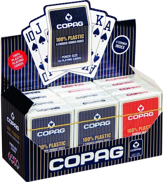 Copag Display met 12 decks pokerkaarten met in alle hoeken een jumbo index; een mooie pokerkaart van hoogwaardige kwaliteit met een jumbo index in alle vier de hoeken van de kaart voor extra duidelijkheid op alle tafels en in alle omstandigheden, ideaal voor de pokerspeler.