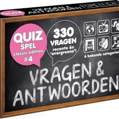 Vragen & Antwoorden – Classic Edition #4 is een pocketformaat (brievenbuspost!) quiz spel (voor 2-6 spelers vanaf 12 jaar) dat zowel als aanvulset / uitbreiding bij andere trivia spellen maar ook als quiz spel op zich gebruikt kan worden. Het spel bevat 55 kaartjes met totaal 330 vragen… z??r recent afgewisseld met ‘evergreens’! De vragen (gemaakt door Marian van Eupen; d? quizvragenmaker van Nederland!) komen uit de 6 bekende categorie?n, gemakkelijk herkenbaar aan de icoontjes. Vragen & Antwoorden… h?t quizspel van dit moment! Niet in de laatste plaats omdat ze makkelijk tijdens videobellen gespeeld kunnen worden! Het past in iedere broekzak en je kunt het spelen waar jij maar wilt (ook via videobellen!). Er bestaan inmiddels alweer 14 edities! Het trivia spel heeft geen ingewikkeld spelmechanisme. Je gaat gewoon lekker elkaars kennis testen.