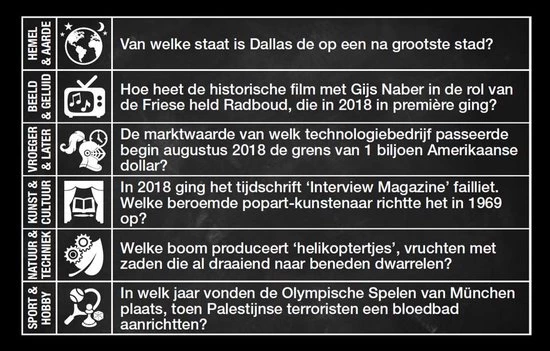 Vragen & Antwoorden – Classic Edition #7 is een pocketformaat (brievenbuspost!) quiz spel (voor 2-6 spelers vanaf 12 jaar) dat zowel als aanvulset / uitbreiding bij andere trivia spellen maar ook als quiz spel op zich gebruikt kan worden. Het spel bevat 55 kaartjes met totaal 330 vragen… z??r recent afgewisseld met ‘evergreens’! De vragen (gemaakt door Marian van Eupen; d? quizvragenmaker van Nederland!) komen uit de 6 bekende categorie?n, gemakkelijk herkenbaar aan de icoontjes. Vragen & Antwoorden… h?t quizspel van dit moment! Niet in de laatste plaats omdat ze makkelijk tijdens videobellen gespeeld kunnen worden! Het past in iedere broekzak en je kunt het spelen waar jij maar wilt (ook via videobellen!). Er bestaan inmiddels alweer 14 edities! Het trivia spel heeft geen ingewikkeld spelmechanisme. Je gaat gewoon lekker elkaars kennis testen.