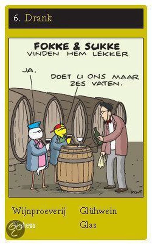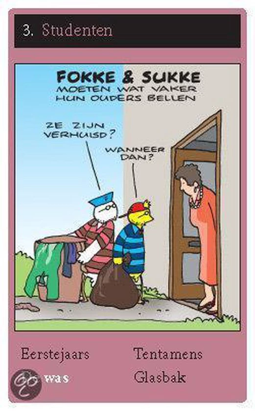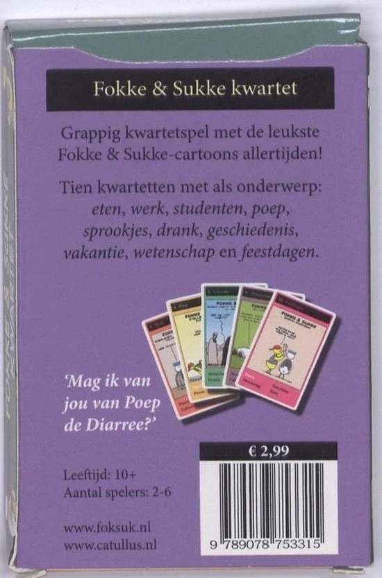 Grappig kwartetspel met de beste Fokke & Sukke-cartoons allertijden! Tien kwartetten met als onderwerpen: eten, werk, studenten, poep, sprookjes, drank, geschiedenis, vakantie, wetenschap en feestdagen. “Mag ik van jou van Poep de Diarree?” Leeftijd: 10+ , aantal spelers: 2-6