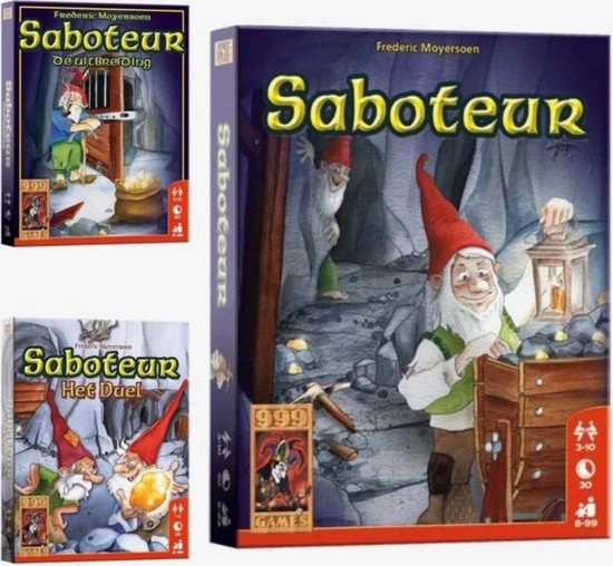 In dit Saboteur kaartspel voor 3-10 spelers leggen de spelers met speelkaarten een mijnenstelsel met gangen aan. De spelers krijgen in het geheim een rol toegewezen. De dwergen proberen via de gangen een route naar een kaart met een verborgen edelsteen aan te leggen. De saboteurs proberen dit te verhinderen. Afhankelijk van jouw rol verdien je winstpunten (goudklompjes) met succes of een mislukking. Het Saboteur spel bevat ook nog actiekaartjes, waarmee je andere spelers kunt hinderen of informatie over de locatie van de edelsteen kunt verzamelen. 999 Games distribueerde tot voor kort de meertalige editie van Amigo. Het commerci?le succes heeft geleid tot deze eigen uitgave.