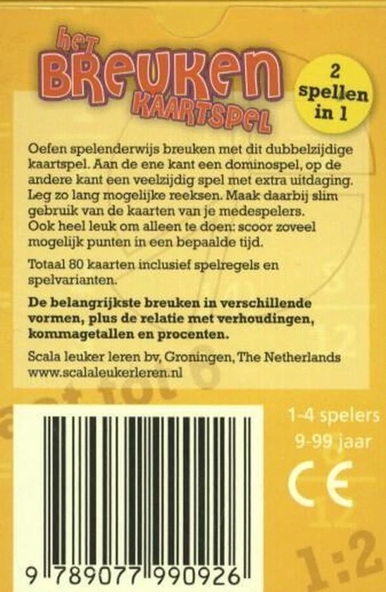 Stambreuken in verschillende vormen, plus veelgebruikte breuken en het verband met kommagetallen en procenten. Bij de dominovariant gaat het erom dat de spelers breuken met dezelfde waarde tegen elkaar leggen. Je mag dus een kaart aanleggen bij een pizzapunt waarbij de helft is ingekleurd. Speel je met de andere kant van de kaarten, dan mag je meer reeksen leggen en ook bij medespelers aanleggen of een kaart wegpakken. Je kunt er bij deze kant ook voor kiezen de waarden op volgorde van minder / meer te leggen of breuken die samen een hele zijn bij elkaar te leggen. Leeftijd: vanaf 9 jaar.